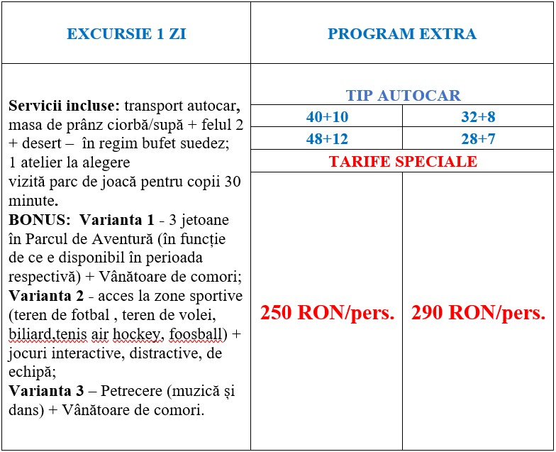 Nota: Rezervarea pentru mai multe activitati care depasesc valoarea pachetului din program se va face cu cel putin 7 zile inainte de data excursiei rezervate, si este valabila doar in urma confirmarii in scris a organizatorilor!