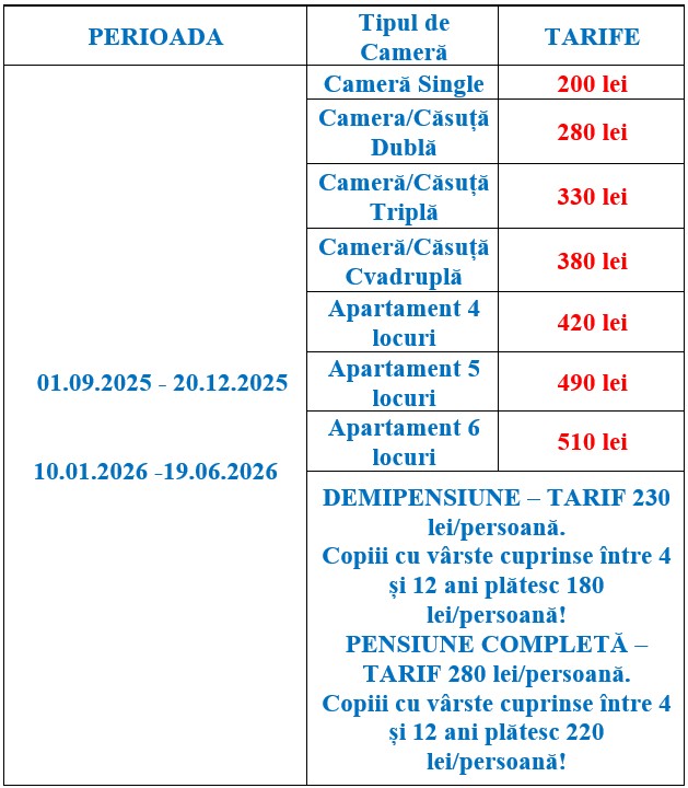 Tarifele sunt exprimate in RON/ camera/ noapte